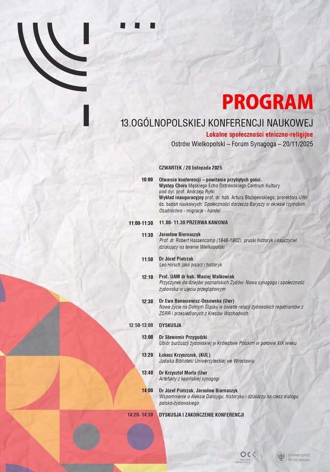 W dniu 20 listopada 2025 roku odbyła się w Ostrowie Wielkopolskim XIII Ogólnopolska Konferencja Naukowa „Lokalne społeczności etniczno-religijne”. Wydarzenie to zostało zorganizowane przez Ośrodek Badań nad Historią i Kulturą Żydów z Południowej Wielkopolski przy współpracy z Ośrodkiem Instytutu Studiów Klasycznych, Śródziemnomorskich i Orientalnych Uniwersytetu Wrocławskiego i Ostrowskim Towarzystwem Naukowym, przy współudziale Ostrowskiego Centrum Kultury.