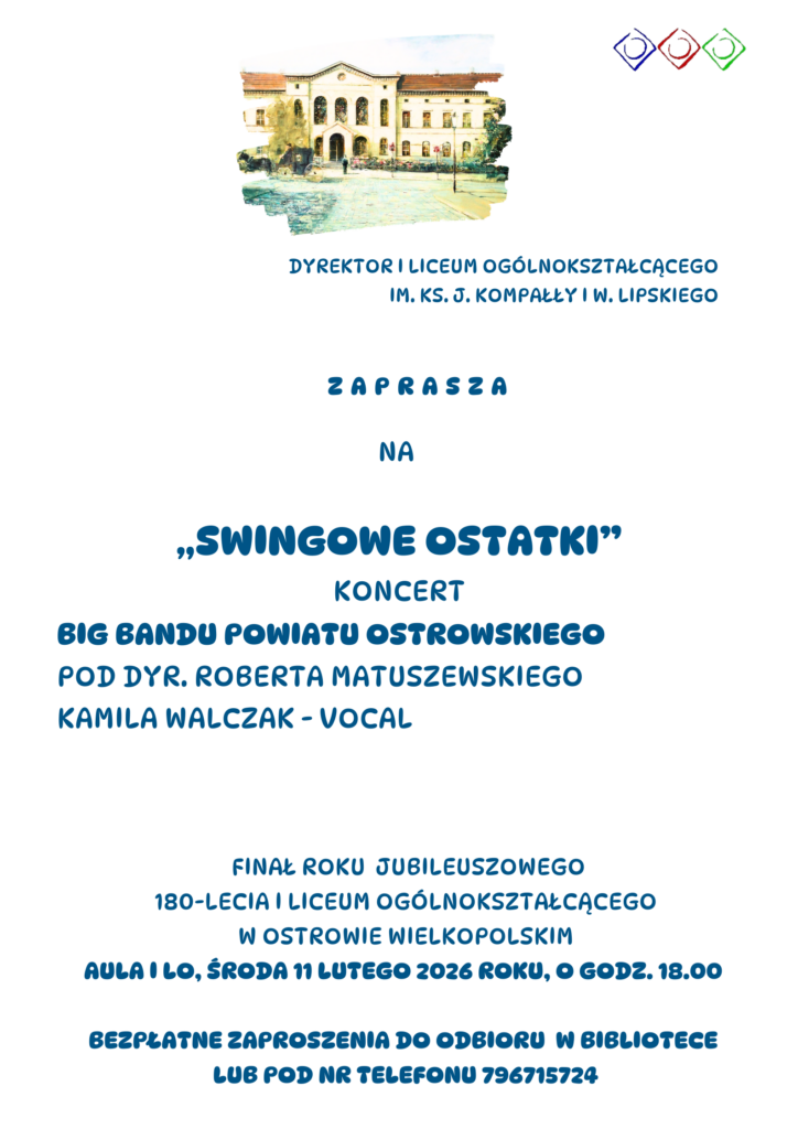 Dyrektor I Liceum Ogólnokształcącego w Ostrowie zaprasza na koncert ” Swingowe ostatki” w wykonaniu Big Bandu Powiatu Ostrowskiego ze specjalnym udziałem solistki Kamili Walczak.